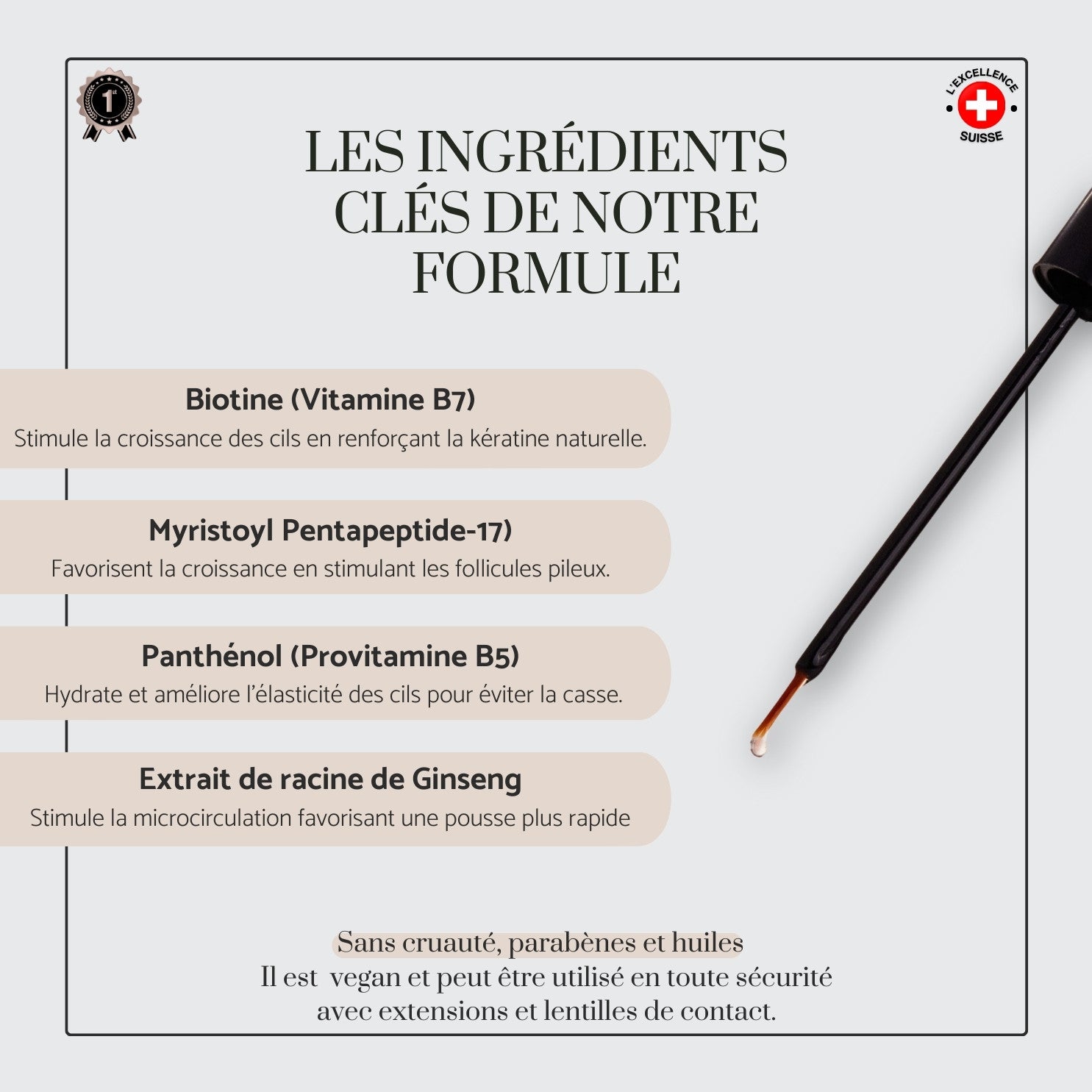 Les ingrédients de notre sérum pour la pousse des cils sont les suivants :